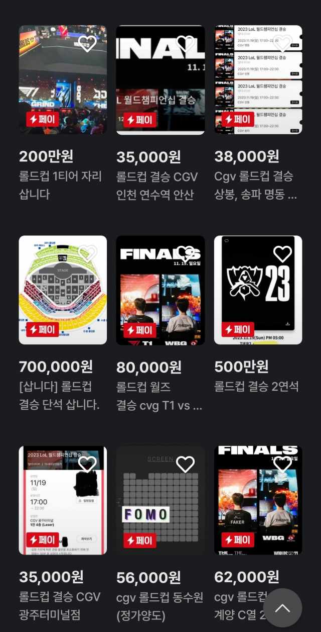 이미 결승전 티켓 판매분 1만8000장은 온라인 예매를 통해 매진됐었습니다. 가장 저렴한 티어8석이 8만원, 최고가인 티어1석이 24만5000원에 판매됐었습니다. 하지만 16일 온라인 중고 거래 플랫폼에서 티어1석이 최고 300만원에 거래된 것을 시작이었습니다. 표를 구하지 못한 일부 팬들이 1000만원이 넘는 값에 티켓을 구하겠다고 요청하는 글이 쇄도한 것도 있어 논란이 일고 있습니다.