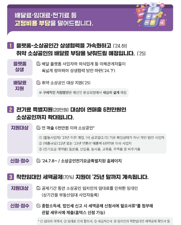 - 전기료 및 임대료 지원 : 연매출 6천만 원 이하의 소상공인을 대상으로 전기료 지원이 확대되며, 착한 임대인 세액공제가 2025년까지 연장됩니다.