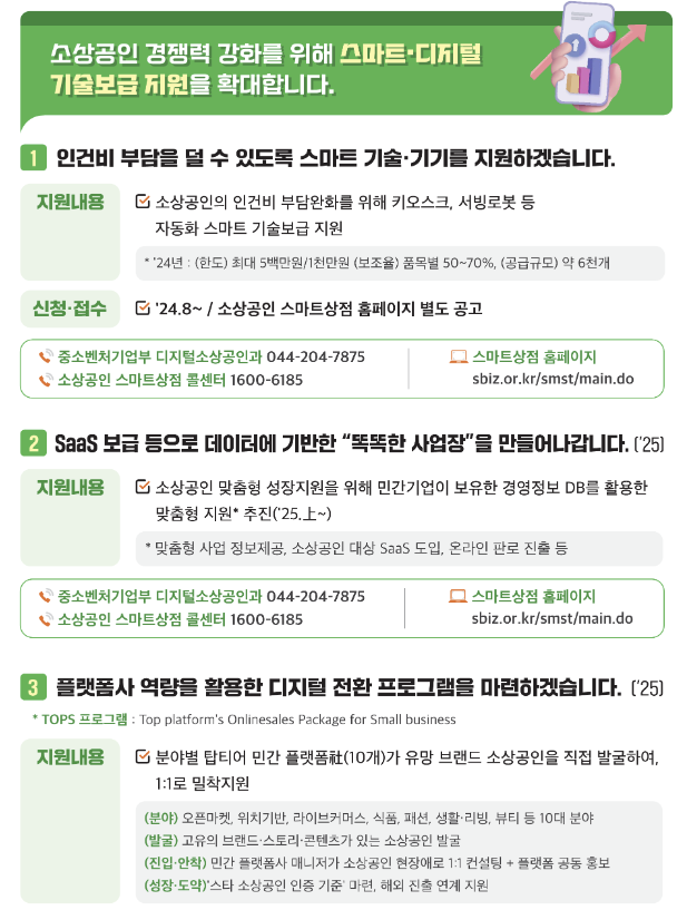 - 스마트 디지털화 : 소상공인에게 스마트 기기 및 소프트웨어를 보급하여 매출 관리와 고객 관리 효율성을 높이는 데 도움을 줍니다.