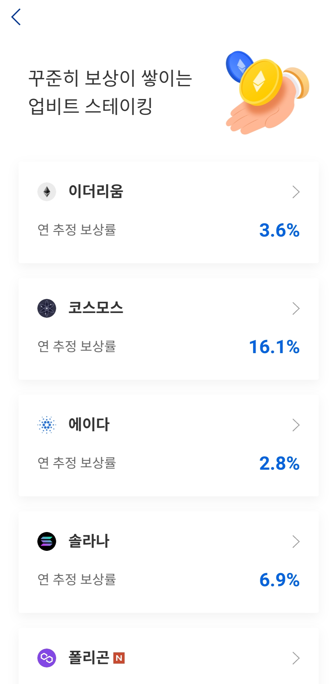 2. 상단의 ' 스테이킹 ' 버튼을 누르고, 하단의 항목들 중 원하는 코인을 들어갑니다.