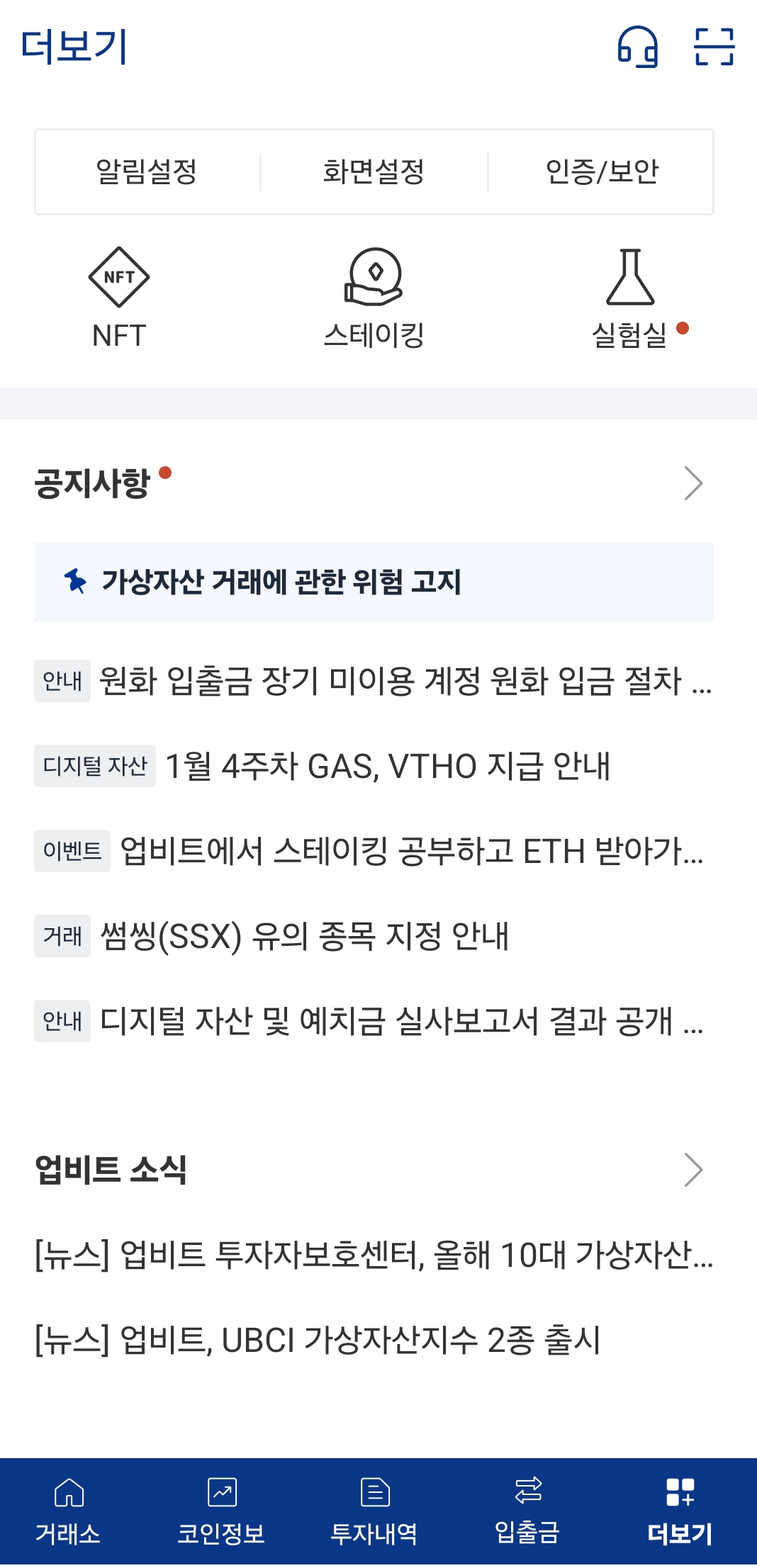 1. 업비트 앱 하단 메뉴에서 ' 더보기 ' 를 들어갑니다.