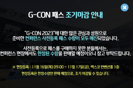 현재 부산에서 개최되는 ' 지스타 2023 '의 경우 준비된 입장권이 모두 마감되었습니다. 11월 16일 09시에 벡스코 컨벤션홀 1층에서 현장등록으로 한정수량 한에 구매가 가능하다고 합니다.