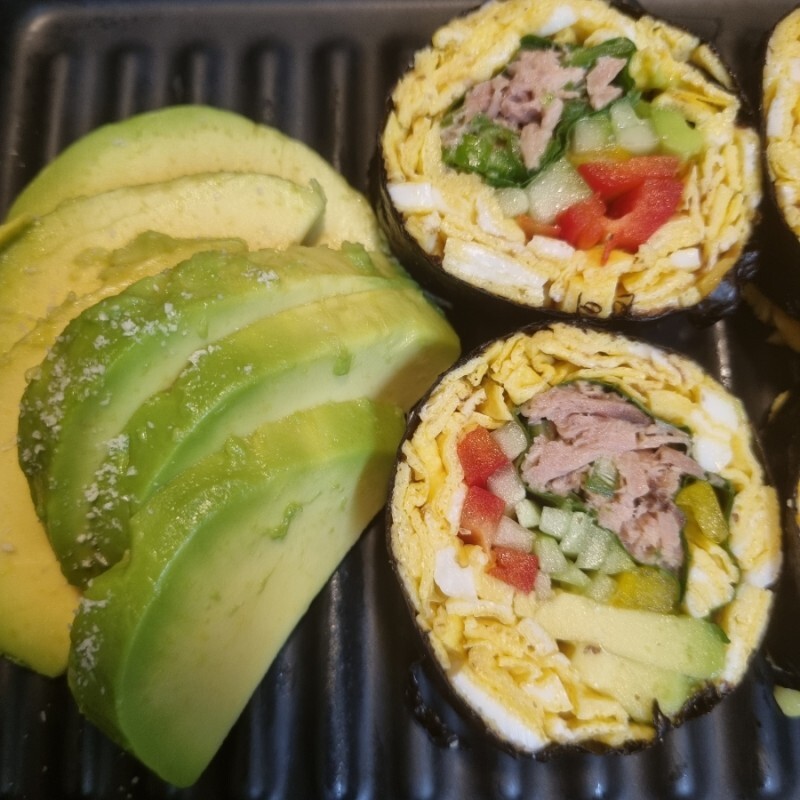 김밥용 김을 깔고, 삶은 계란, 양파, 오이, 아보카도, 닭 가슴살 등을 적당한 두께로 배치합니다.