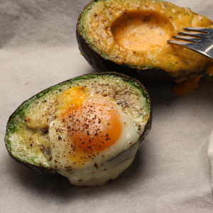 아보카도 반쪽의 씨 근처를 조금 파내어 달걀을 넣습니다.
