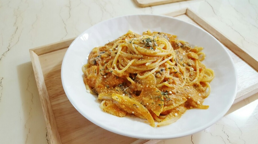 콩면을 체에 밭쳐 물기를 빼고, 리코타 치즈와 로제 소스를 섞어준다.